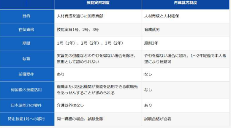<技能実習制度と育成の全体比較表>*JITCO 引用